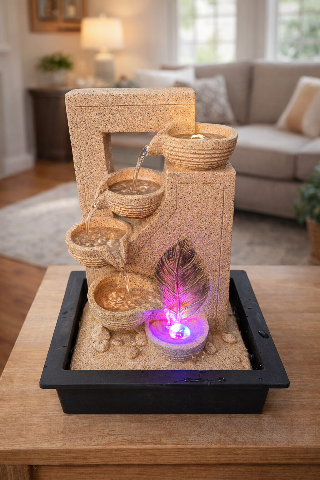 Bring peace and elegance to your space with this beautifully crafted Multi-Tier Indoor Tabletop Water Fountain. Designed with a natural stone-textured finish, this fountain features a cascading waterfall flowing smoothly from one bowl to another, creating a soothing and relaxing water sound.
